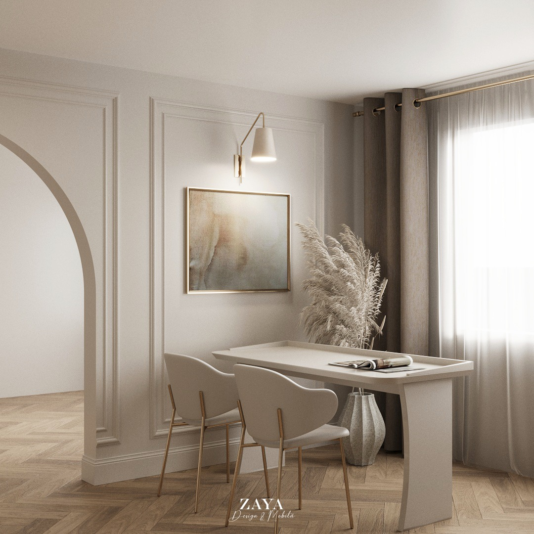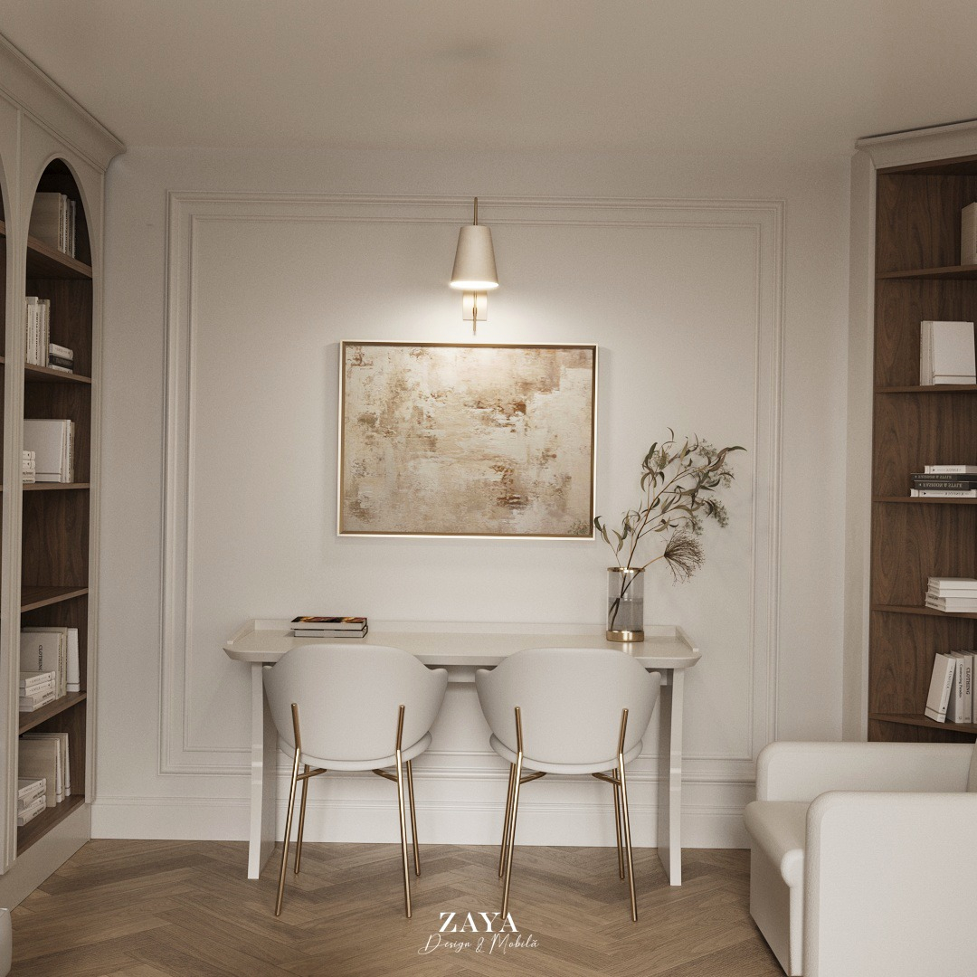 UN ANSAMBLU DE MOBILIER REALIZAT PE COMANDA PENTRU O CAMERA DE LECTURA, ALCATUIT DIN 3 CORPURI DE BIBLIOTECI CU RAFTURI DESCHISE, 2 BIROURI DE CATE 2 PERSOANE, O CANAPEA SI O MASUTA DE LIVING. PIESELE AU FOST REALIZATE DIN MDF VOPSIT SI PAL MELAMINAT.